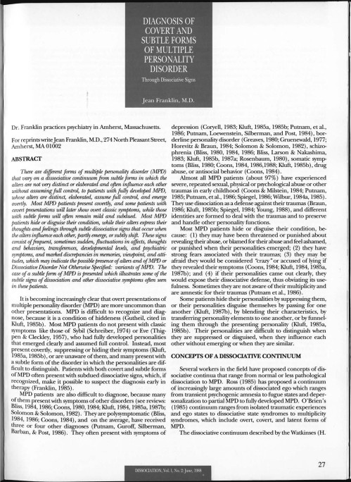As an academic myself, I believe that it is important acknowledge that academia is inherently political, even though it’s not often presented as such. Even papers that make it through peer review often include bias and findings subject to interpretation, especially in softer sciences like psychology. Many dissociative experiences cannot be validated by traditional scientific techniques, thus leading to further division in the field about how to understand dissociation. This is, of course, one of the reasons why DID is considered to be a controversial diagnosis. The papers on this page are ones I’ve found interesting, but are not necessarily ones I fully agree with.